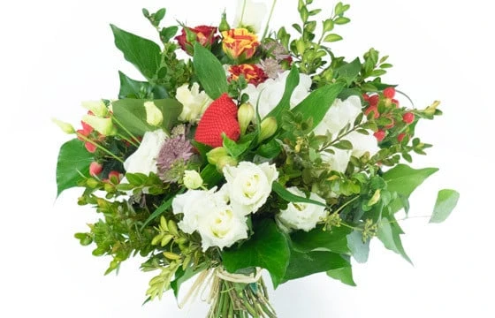 Commandez un bouquet de fleurs pour votre bien-aimé(e). Des fleurs principalement rouge et blanche avec une touche de rose rouge-orangé pour apporter une note de lumière. Livraison de rose bicolore, et hortensia blanc à domicile ou sur un lieu de travail. Les assemblages de fleurs sont réalisés avec amour par un Artisan Fleuriste qui livre en main propre toute ses réalisations florales. Pour chaque commande passée sur notre site internet, 50 cts seront reversés à une association caritative de votre choix, celle qui vous touchera le plus. N’hésitez pas à nous contacter par téléphone 7 jours sur 7 pour toute information.