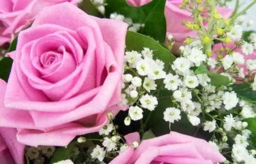 Détail du bouquet: Bouquet rond de roses dans les dégradés de rose. Cette création florale réalisée par un artisan fleuriste local est composée de roses, de gypsophile et feuillages. (Ref Florale : 1333- Lyon). Visuel non contractuel – Visuel correspondant à la formule Meilleur Compromis.