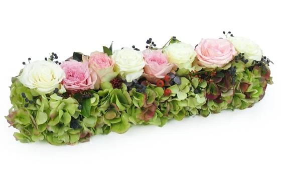 Détail de la composition : Chemin de roses pour un deuil dans les tons roses & blancs du nom de « Cérès » Cette création florale réalisée par un artisan fleuriste local est composée de rose, baie de saison, hortensia et une pointe de feuillage. Longueur 50 cm environ (Formule « Meilleur compromis »)(Fleurs variables selon les saisons et la disponibilité en magasin tout en gardant l’esprit, la forme et les couleurs)(Ref Florale : 9320- Cérès). Visuel non contractuel – Visuel correspondant à la formule Meilleur Compromis – Non compatible avec une crémation.