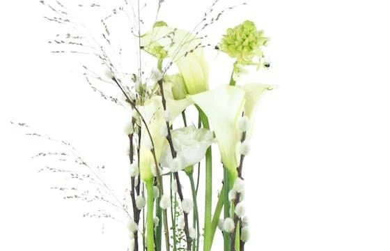 Détail de la composition: Assemblage de fleurs en hauteur de couleur blanche. Composé d’arum ou lys, oeillet ou rose, fleurettes blanches, graminée, chaton (ou autre branche bois) et feuillages diverses à la base. Le tout piqué dans un contenant en céramique rond foncé. (Fleurs et contenant céramique variables selon les saisons et la disponibilité en magasin tout en gardant l’esprit, la forme et les couleurs). (Ref Florale : 2312 – Lima). Visuel non contractuel – Visuel correspondant à la formule Meilleur Compromis.