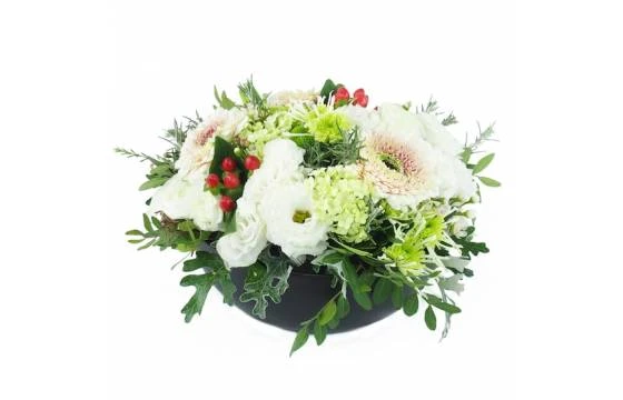 Détail de la composition: Assemblage de fleurs rose pastel, blanc, vert et une pointe de rouge. Composé de lisianthus, gerbera (ou germini), hypericum, fleurette et diverse feuillage. Le tout piqué dans un contenant en céramique rond de couleur foncé. (Fleurs et contenant variables selon les saisons et la disponibilité en magasin tout en gardant l’esprit, la forme et les couleurs). (Ref Florale : 2315 – Toronto). Visuel non contractuel – Visuel correspondant à la formule Meilleur Compromis.