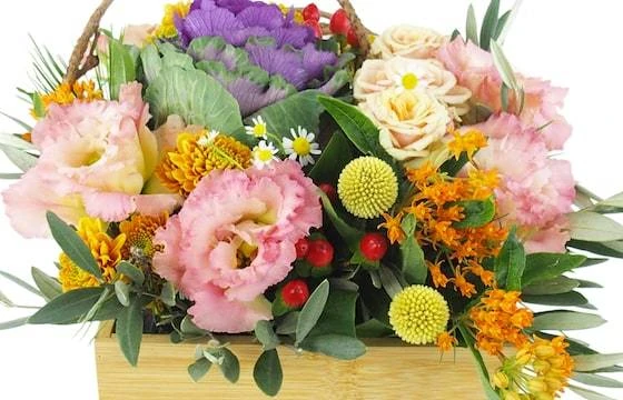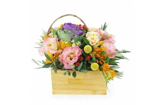 Détail de la composition: Assemblage de fleurs piquées rose, violet-mauve, orange, jaune et rouge. Réalisé par un artisan fleuriste local il se compose de lisianthus, chou, rose, feuillage et décoration bois naturel. Le tout dans un contenant carré en bois. (Fleurs et contenant variables selon les saisons et la disponibilité en magasin tout en gardant l’esprit, la forme et les couleurs). (Ref Florale : 2321 – Miami). Visuel non contractuel – Visuel correspondant à la formule Meilleur Compromis.