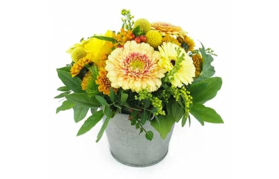 Détail de la composition: Assemblage de fleurs dans les tons jaune et orange. Composé de gerbera, germini, rose, fleurette et feuillage. Le tout piqué dans un contenant en zinc rond. Cette création florale est réalisée par un artisan fleuriste local. (Fleurs et contenant zinc variables selon les saisons et la disponibilité en magasin tout en gardant l’esprit, la forme et les couleurs). (Ref Florale : 2307 – Tokyo). Visuel non contractuel – Visuel correspondant à la formule Meilleur Compromis.